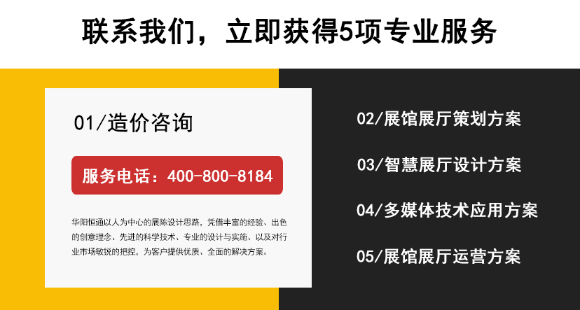 以上便是展厅设计公司小编总结的三个基本原则,相信大家可以通过这三个基本原则建设出空间与美感并存的主题展厅。华阳恒通展览集团致力于智慧展厅、党建展厅、企业展厅、艺术展厅等多类型展陈空间,运用科技+绿色的理念为客户提供从策划设计到搭建施工的一站式服务,为您打造以人为本的展示空间。